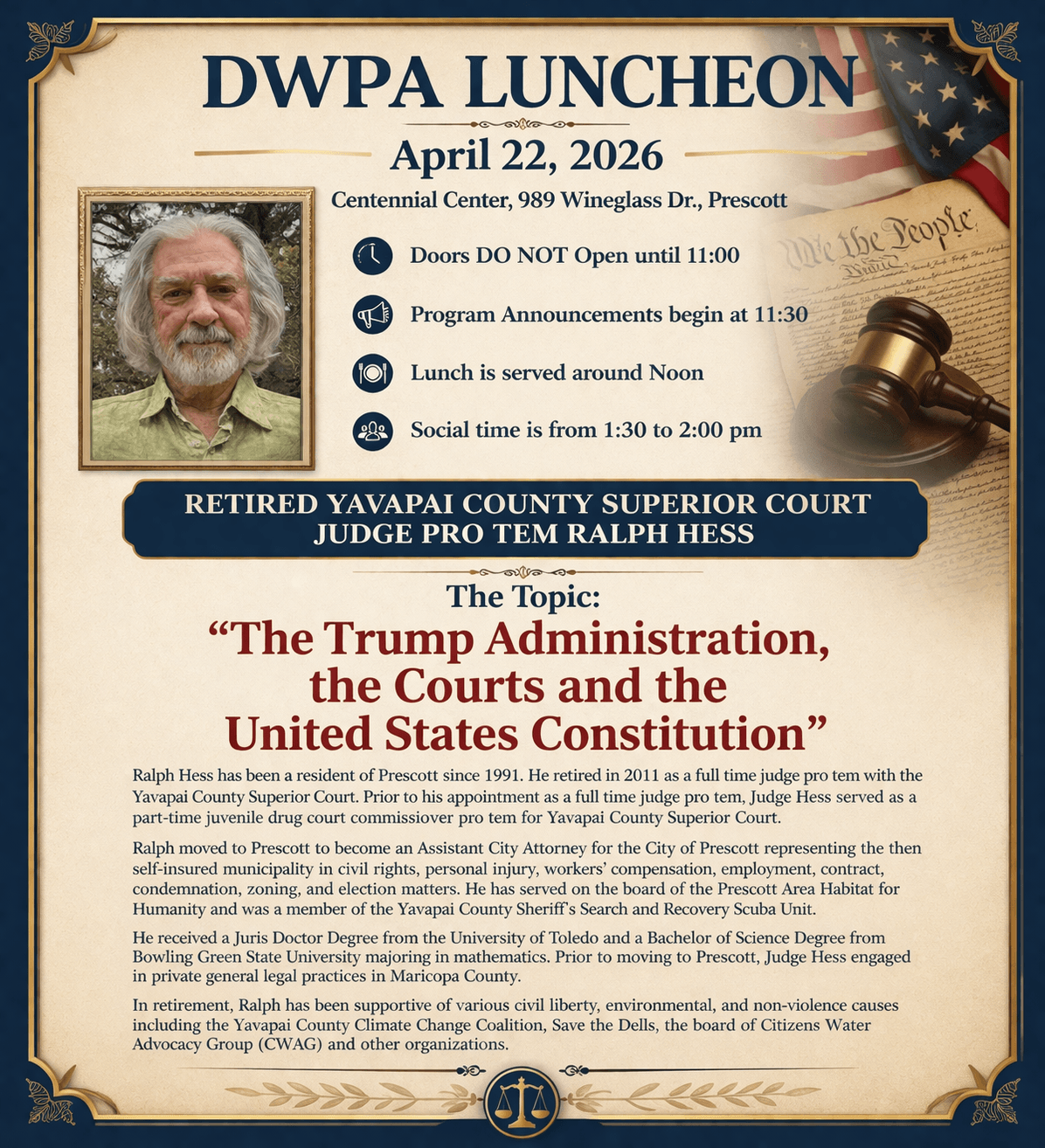 The memorial service for Dawn Knight, a prominent Arizona Democrat and one of DWPA’s founders will be held at 11 AM at the Church of Christ, 1495 E Rosser Street. Reception at 1 PM at the Best Western Prescottonian Conference Room, 1317 E. Gurley.